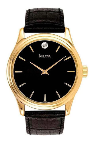 Este reloj Bulova 97F55 de la colección Corporate tiene un estilo clásico y refinado. Su caja dorada de acero inoxidable de 38 mm se combina con una elegante carátula negra tipo sunray, adornada con un solo diamante engastado a las 12 h. La correa de cuero negro genuino con forro interior beige aporta comodidad y sofisticación, ideal para el hombre que aprecia la elegancia discreta.