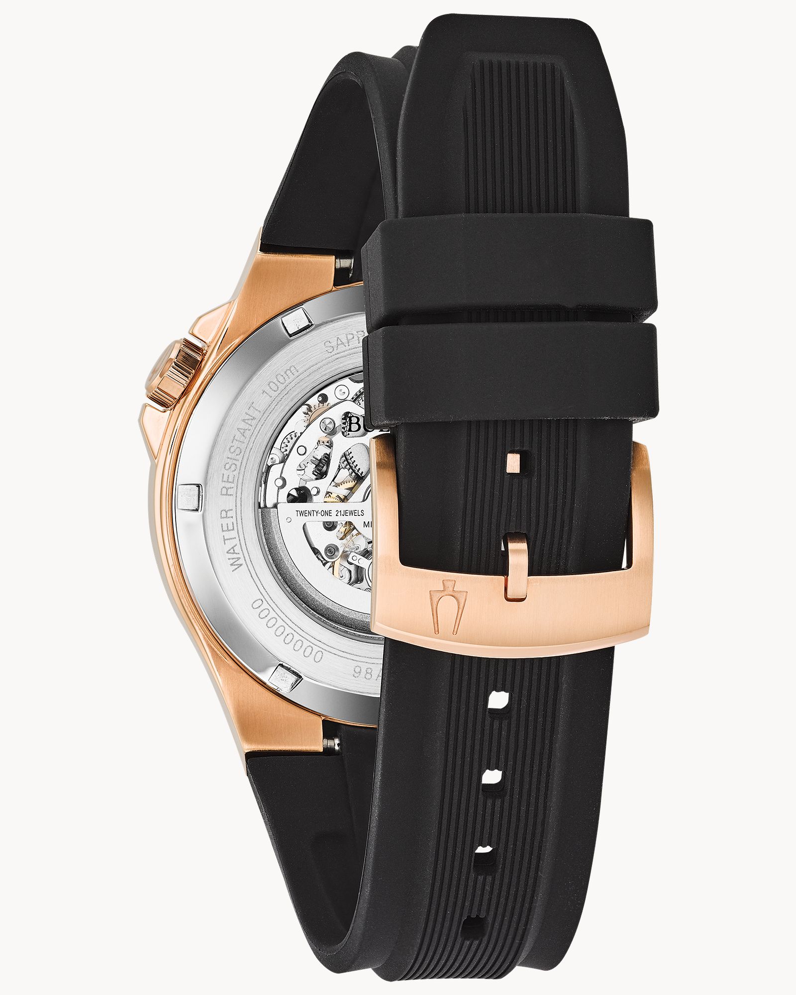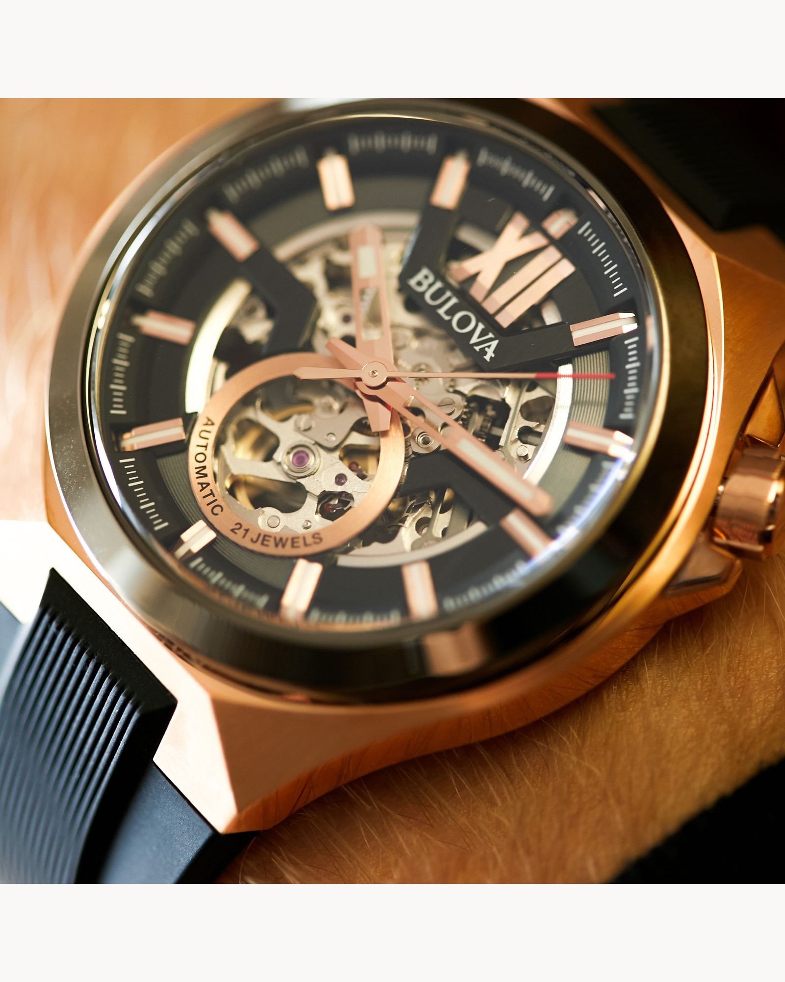 Carátula esqueletada negra con detalles en oro rosa, indicadores y manecillas en oro rosa.